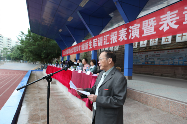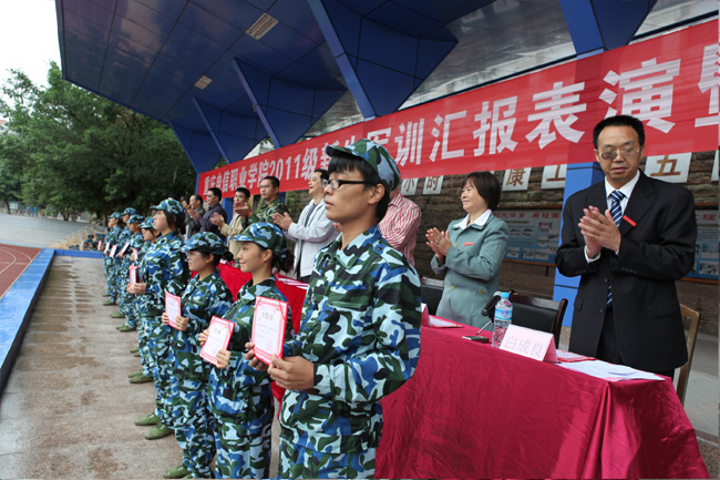 9月19日上午,beat365官网2011级学生军训总结大会在田径场隆重举行。参加军训的同学们以整齐的军容和 昂扬的士气,向学校和承训部队领导展示了军训的成果。校长沈清淮,副校长周及至,副校长黎明,校长助理白成良,中国人民武装警察部队重庆总队 第七支队指导员隗功明,学校相关部门负责人,以及学校董事王成玮先生、韩玉军先生及2011级全体辅导员出席了总结大会,全体承训官兵及2011级全体学生参加了军训总结大会,会议由校长助理白成良主持。
