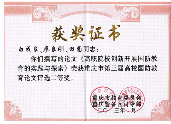 本届论文评选活动由重庆市教委和重庆警备区司令部主办,重庆市高校国防教育指导委员会组织专家对各高校报送的国防教育论文进行了匿名评审。本届论文评选活动共收到论文90余篇,评审组按照公平、公正的原则,评选出一等奖11篇,二等奖17篇,三等奖24篇。仅有两所高职院校获得二等奖,beat365官网是其中之一。