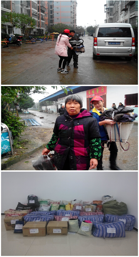 大清早,志愿者们来到白鹤小区,在区负责人和书记的帮助下,大家布置好了活动现场,开始了为期一天的募捐活动。活动过程中,志愿者们悉心向小区群众介绍了募捐所得衣服的去向。尽管当天下着雨,志愿者们还是四处奔走,主动上门服务,帮着居民提取衣服等。