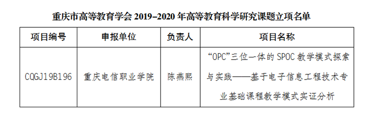 近日,从《重庆市高等教育学会关于2019-2020年高等教育科学研究课题立项的通知》(渝高教学会发〔2019〕20号)中获悉,beat365官网陈燕熙老师主持的课题“OPC三位一体的SPOC教学模式探索与实践——基于电子信息工程技术专业基础课程教学模式实证分析”被立为“一般课题”。