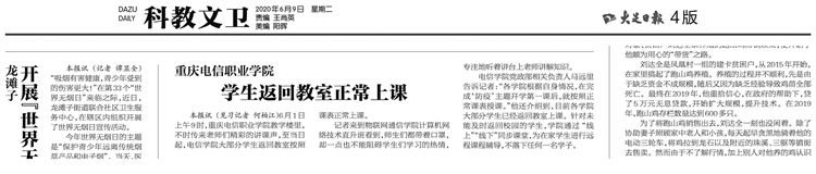 电信学院党政部相关负责人马远里告诉记者:“各学院根据自身情况,在完成‘防疫’主题开学第一课后,就按照正常课表授课。”他还介绍到,目前各学院大部分学生已经返回教室上课。针对未能及时返回校园的学生,学院通过“线上”“线下”同步课堂,为在家学生进行远程课程辅导,不落下任何一名学子。