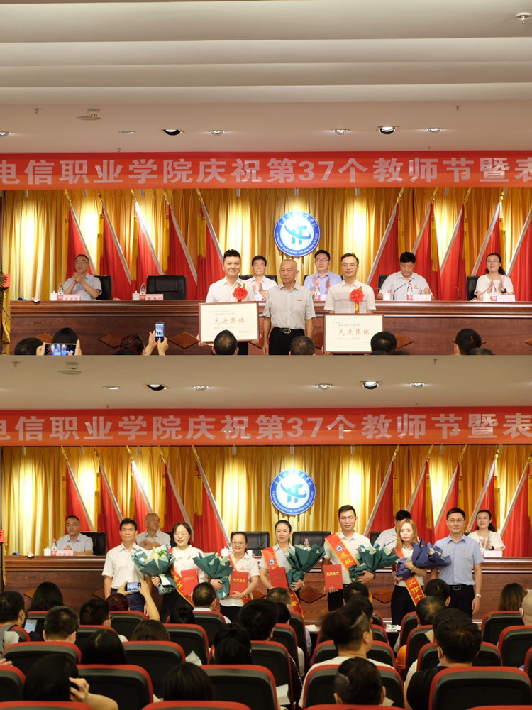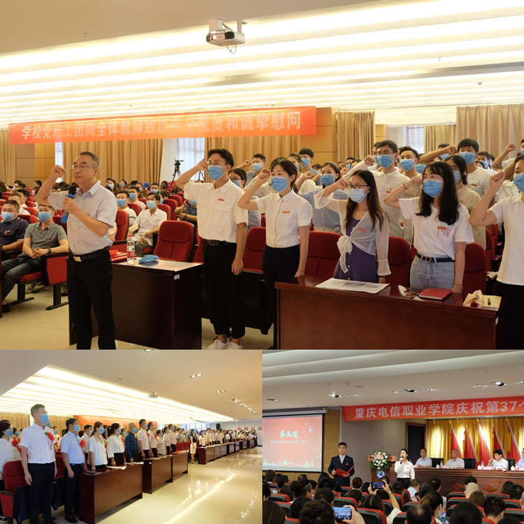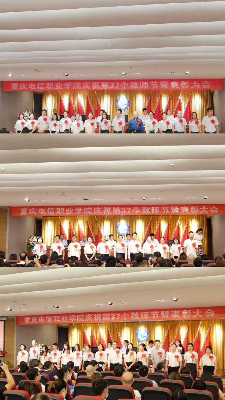 大会在庄严的国歌声中拉开帷幕。会上,党委书记张勇刚宣读了《中共重庆市委教育工作委员会关于表彰教育系统优秀共产党员、优秀党务工作者和先进基层党组织的决定》《中共重庆市委教育工作委员会关于公布重庆市新时代高校党建示范创建和质量创优工作培育创建名单的通知》《beat365平台唯一官网关于表彰第37个教师节先进集体、优秀个人的决定》和《beat365平台唯一官网关于颁发在校工作十年证书的决定》,会上为重庆市新时代高校党建“双创”样板支部——人工智能与电子学院党支部授牌,为重庆市教育系统优秀共产党员文水兵同志颁发荣誉证书,集中对2个先进集体、40余名优秀个人进行了表彰,向“在校工作十年”教职工颁发荣誉证书;副校长皇甫涛带领全体新教师庄严宣誓,全校教职员工共同见证了这一神圣时刻;学生代表为老师们纷纷献花,道上一声老师您辛苦了;随后,两位教师与两位学生带来深情的“一问一答”式诗歌朗诵,为教师节献礼。