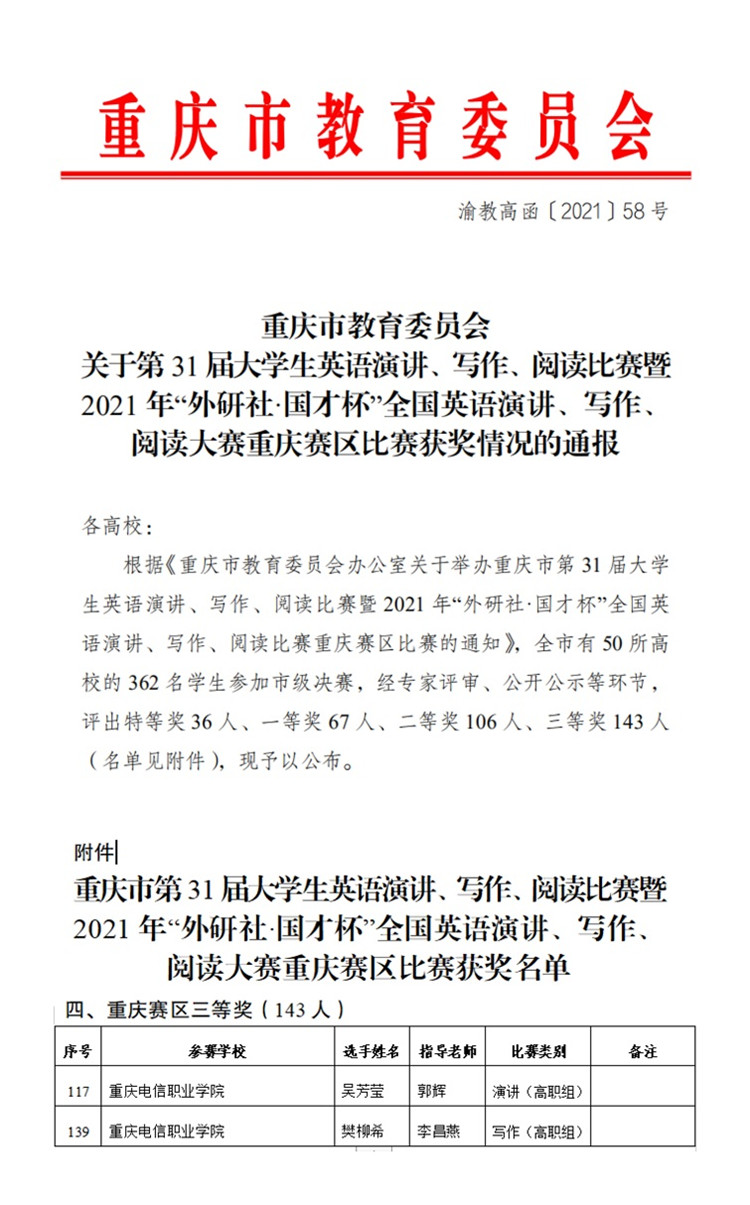 近日,从《重庆市教育委员会关于第31届大学生英语演讲、写作、阅读比赛暨2021年“外研社·国才杯”全国英语演讲、写作、阅读大赛重庆赛区比赛获奖情况的通报》(渝教高函〔2021〕58号)文件中获悉,beat365官网郭辉、李昌燕两位老师指导的学生吴芳莹、樊柳希分别获得英语演讲、写作比赛重庆赛区三等奖。