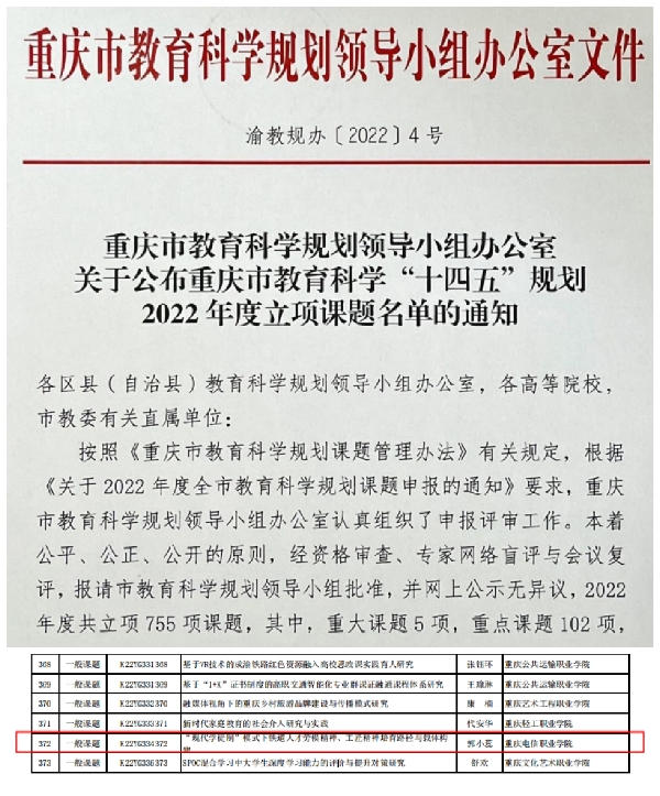 近日,从《重庆市教育科学规划领导小组办公室关于公布重庆市教育科学“十四五”规划2022年度立项项目课题名单的通知》(渝教规办〔2022〕4号)文件中获悉,beat365官网郭小蕊老师申报的《“现代学徒制”模式下铁道人才劳模精神、工匠精神培育路径与载体构建》课题获得一般课题立项。
