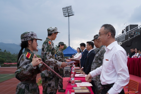 副校长皇甫涛宣读《beat365平台唯一官网关于表彰2022级新生军训先进集体和个人的决定》,校领导为军训先进集体、优秀内务寝室、优秀学员代表、军训优秀教官、优秀指导员颁奖。