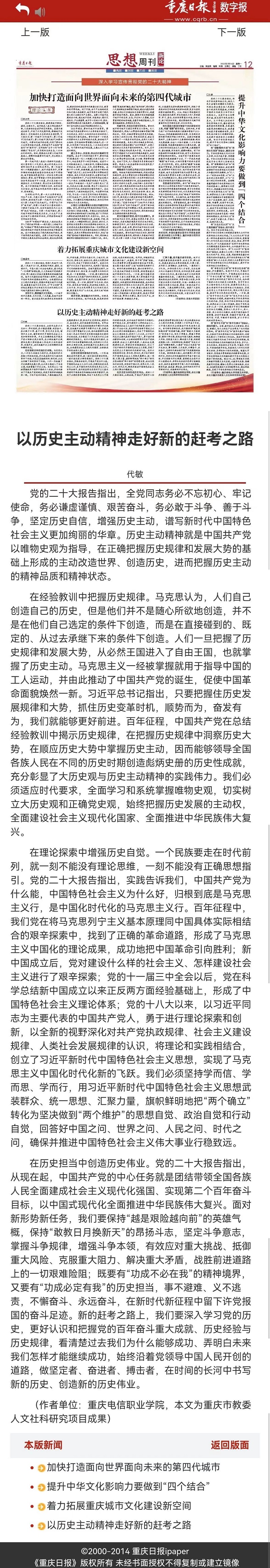 《重庆日报》理论版刊发beat365官网教师署名文章《以历史主动精神走好新的赶考之路》