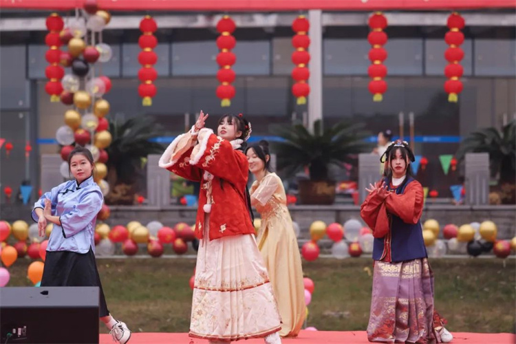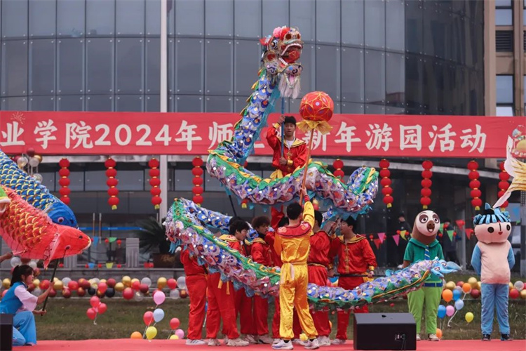 本次迎新年游园活动以《舞龙舞鱼》节目首先点燃活动现场, 在中国“龙”是汉族的图腾,“鱼”是祥瑞之兽,浓浓的迎新年氛围弥漫全场。本次师生迎新年游园活动延续学校传统,将迎新年庆典场地从室内移至室外,扩大全校师生参与度与覆盖面,增加活动的趣味性、文艺性、运动性。本次活动元素以喜庆、热闹、轻松、有趣为主线,营造积极向上、喜乐祥和的新年氛围。