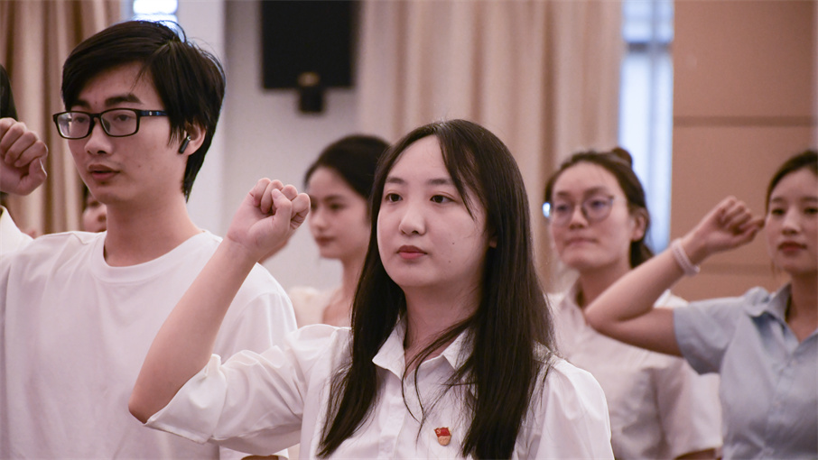 教育与设计学院院长吴智勇带领全体新进教师宣誓,教师代表在现场为新教师佩戴校徽,全校教职员工共同见证了这一庄严时刻。