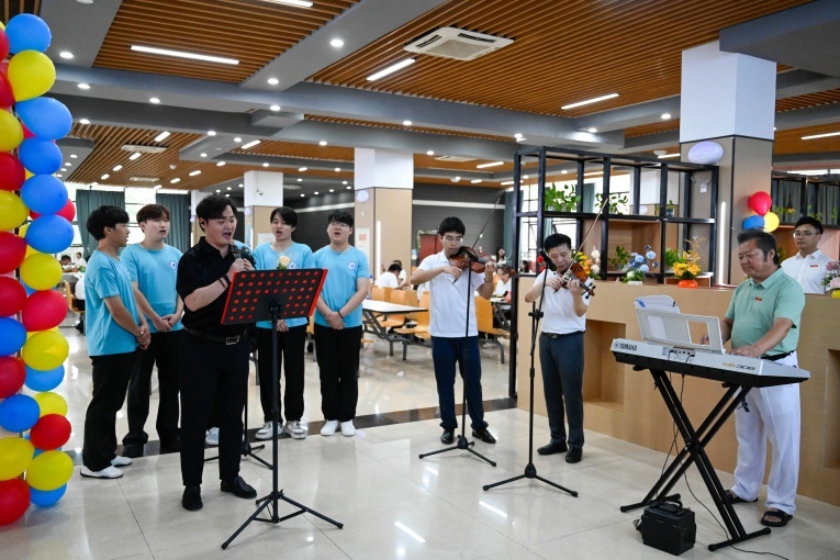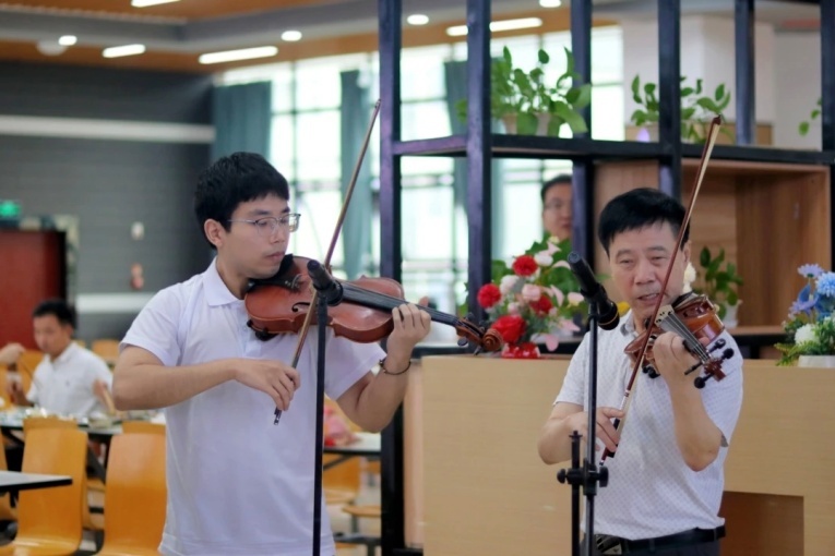9月10日中午,教职工食堂内的温馨氛围再度升级。校团委书记向毅老师、解放军某部文工团小提琴演奏家温羽成老师、著名音乐人蒋永忠老师、小提琴演奏家张浩熙老师携手学生代表,共同带来经典歌曲《每当我走过老师窗前》,庆祝教师节。期间,学生志愿者为老师们送上了亲手制作的精美贺卡,卡片上写满了同学们的心里话,每一笔每一画都是对老师辛勤工作的认可与感恩。
